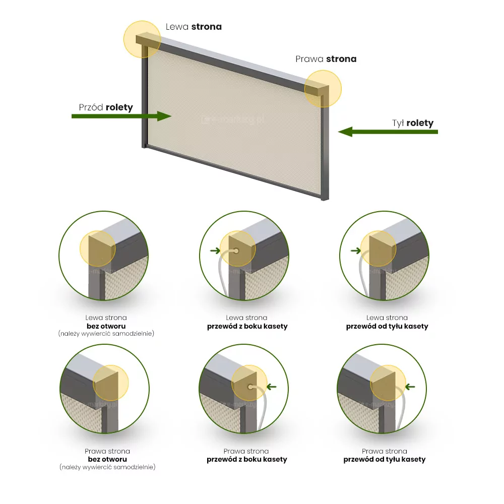 Bei einem elektrischen Antrieb wird das Kabel auf einer Länge von ca. 2m herausgeführt. aus der Öffnung an der Seite oder Rückseite der Reflexkassette. Die Löcher werden vom Hersteller an der bei der Bestellung der Abdeckung angegebenen Stelle oder vor der Montage selbst gebohrt.