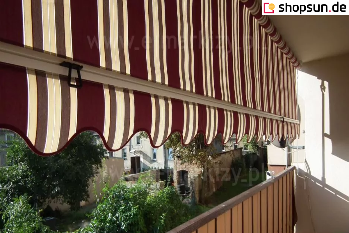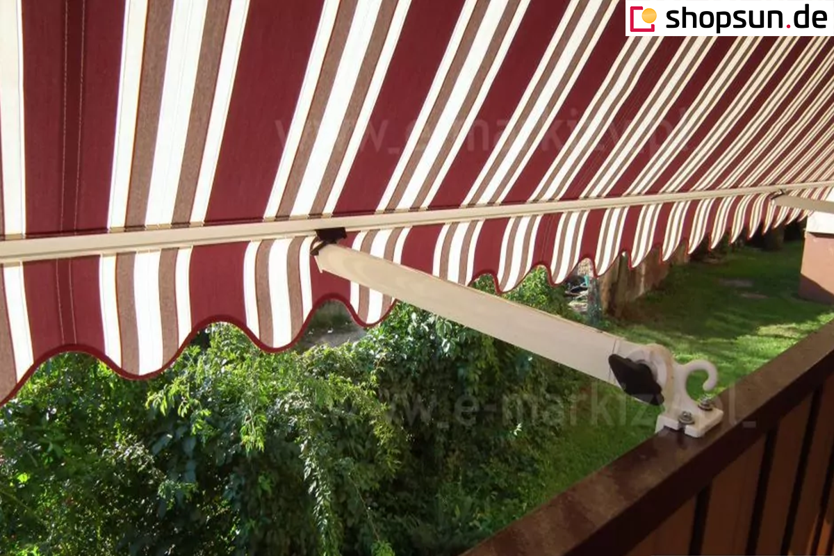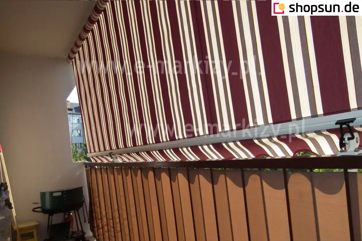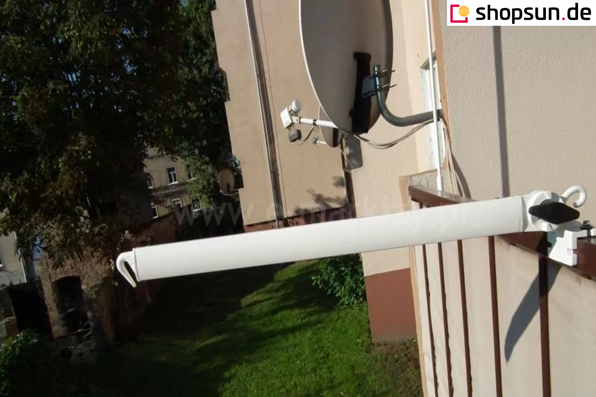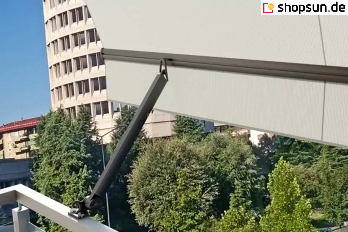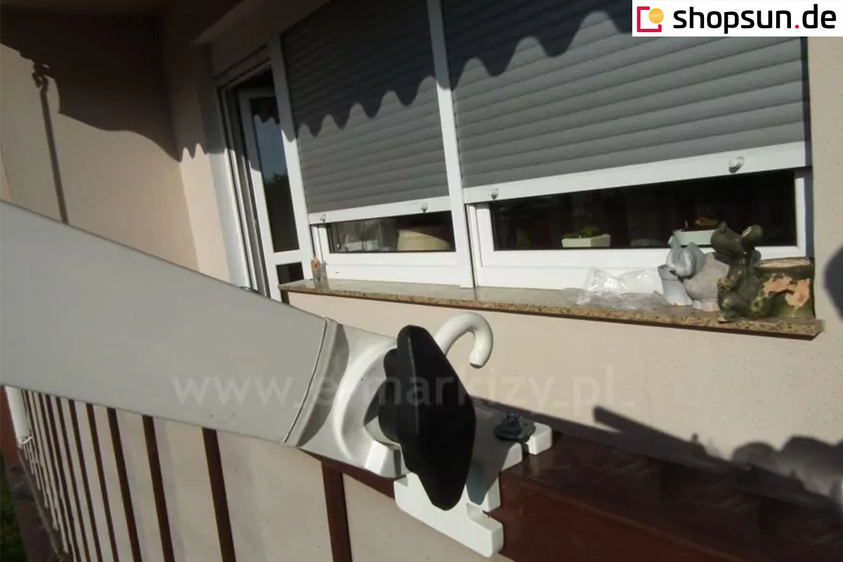 An den Enden und an der Basis der Arme befinden sich Haken, an denen der vordere Balken mit dem Stoff befestigt wird. Die richtige Spannung der Markise wird durch Aufrollen des überschüssigen Tuchs erreicht. Die Geländer-Balkonmarkise ist die am häufigsten gewählte Balkonüberdachung.