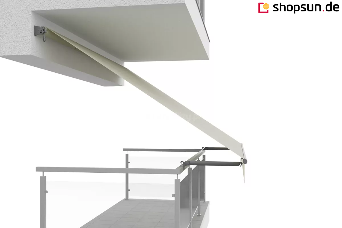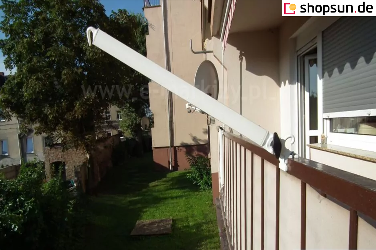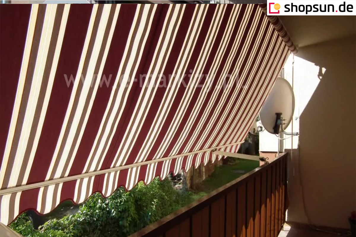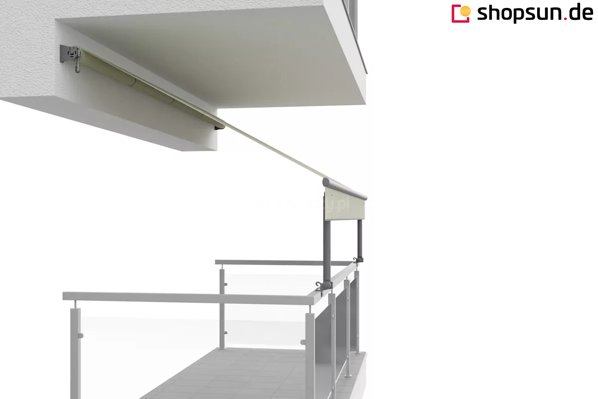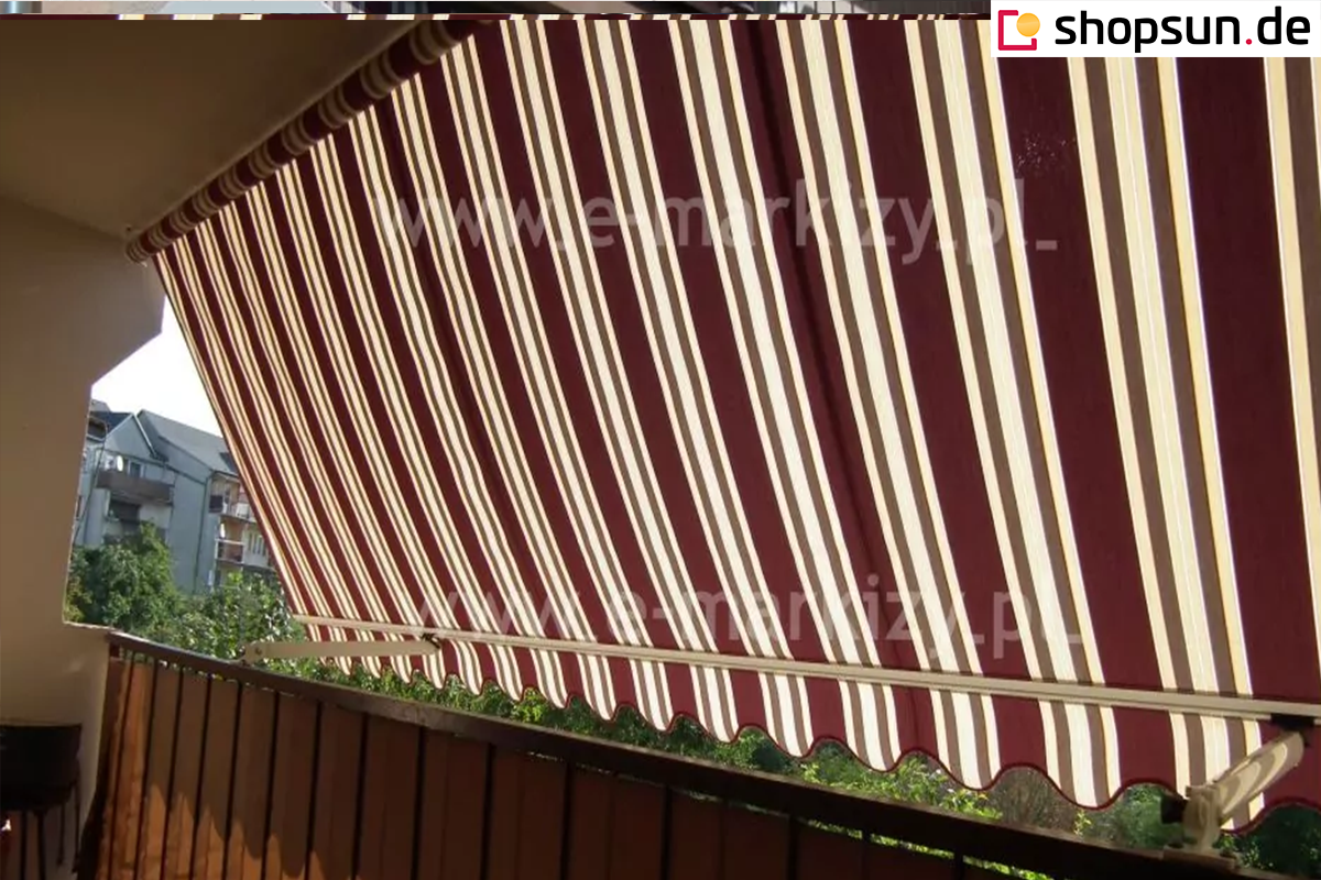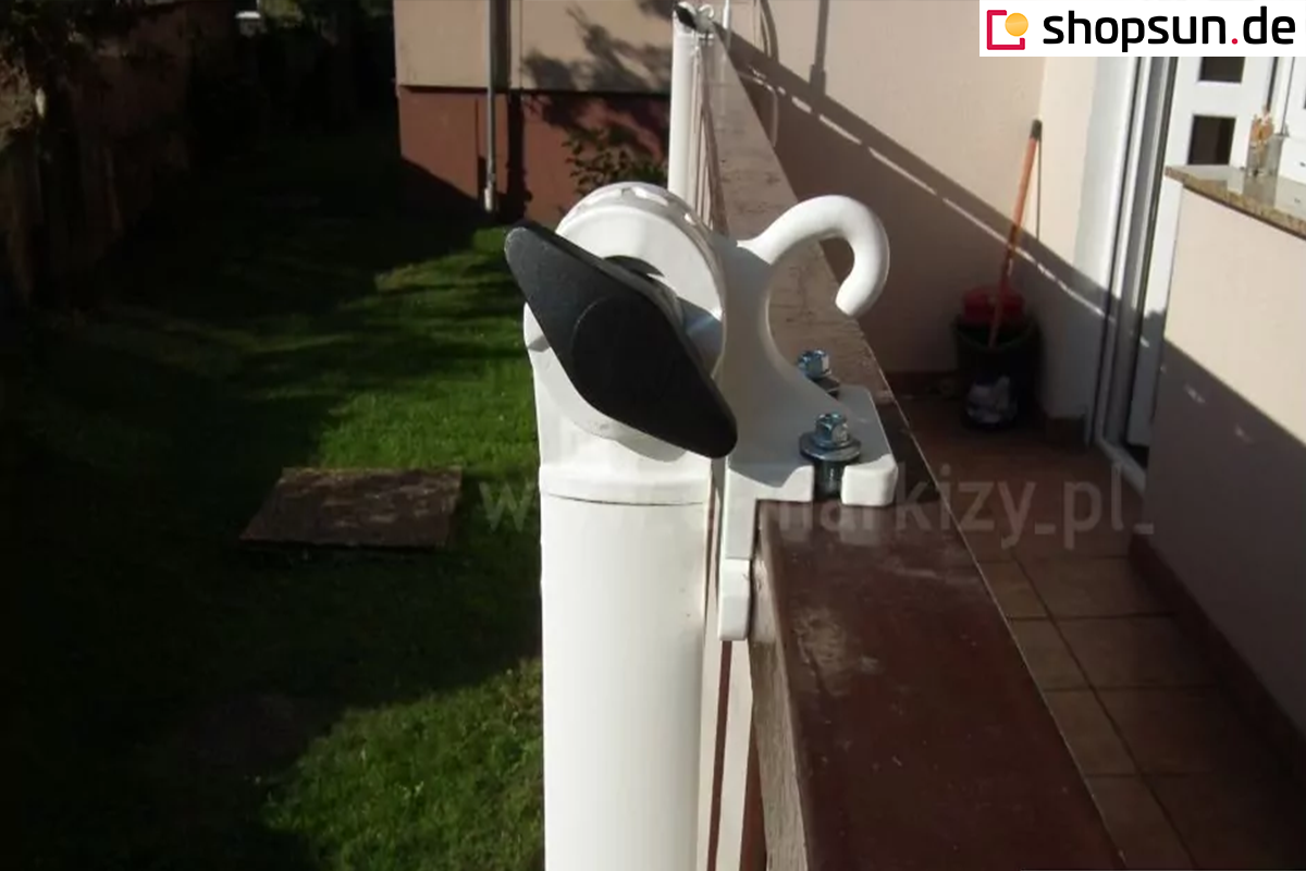 An den Enden und an der Basis der Arme befinden sich Haken, an denen der vordere Balken mit dem Stoff befestigt wird. Die richtige Spannung der Markise wird durch Aufrollen des überschüssigen Tuchs erreicht. Die Geländer-Balkonmarkise ist die am häufigsten gewählte Balkonüberdachung.