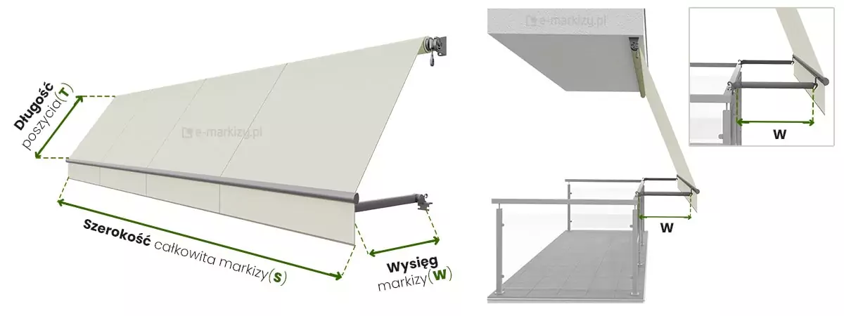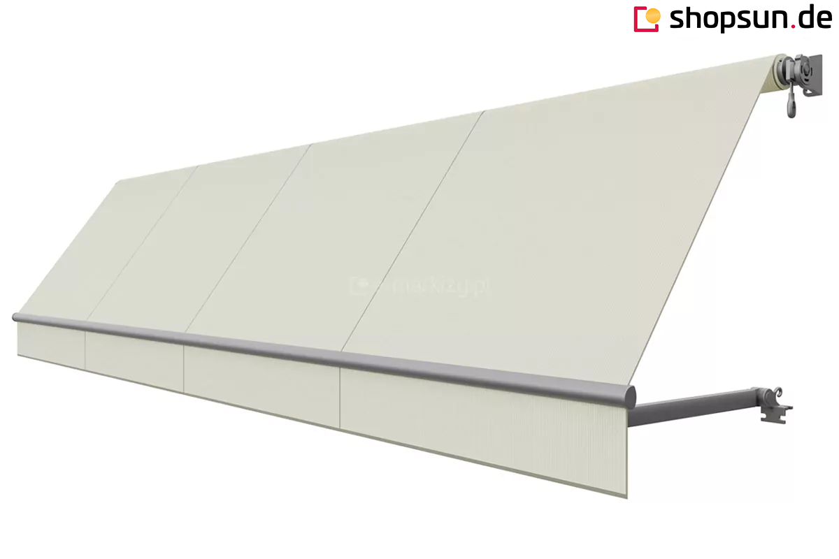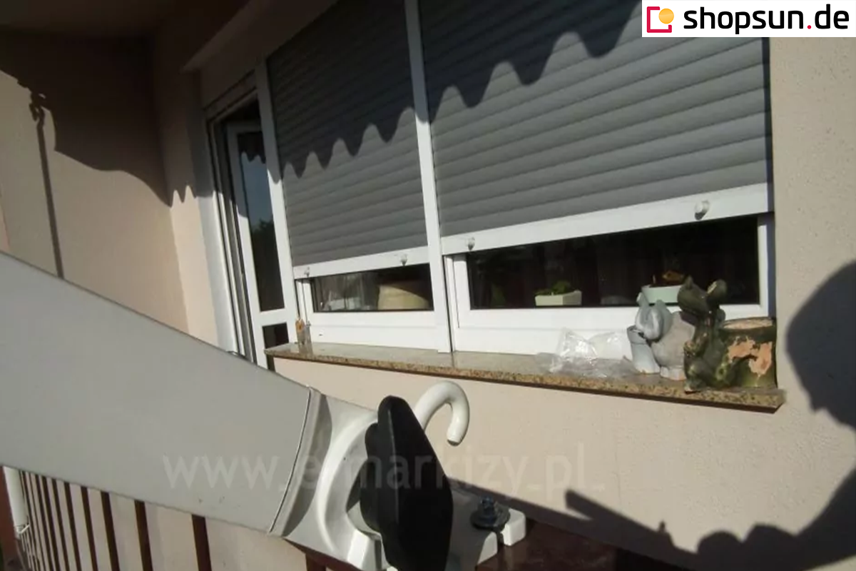 Die Balkonmarkise mit Relingsarmen ist ein ästhetischer Sonnenschutz. Es ist eine praktische Dekoration von Balkonen, Terrassen und Balkonnischen. Die Verwendung von Balustradenarmen bietet eine größere Montagefreiheit auf Balkonen. Strukturelemente sind in fünf Standardfarben pulverbeschichtet.