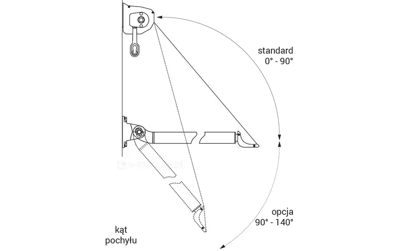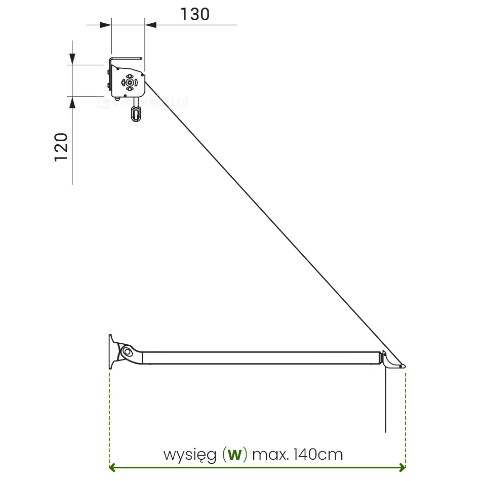 Bei Variante (S) werden die Arme an der Wand montiert. Wir haben die Wahl zwischen 3 Längen: 100, 140 und 180 cm. Die Länge der Arme entspricht in diesem Fall der Ausladung der Markise. (Auf der Wickelhülse wird, unabhängig von der Länge der Arme, ein Stoff mit einer Länge von 210 cm aufgewickelt).