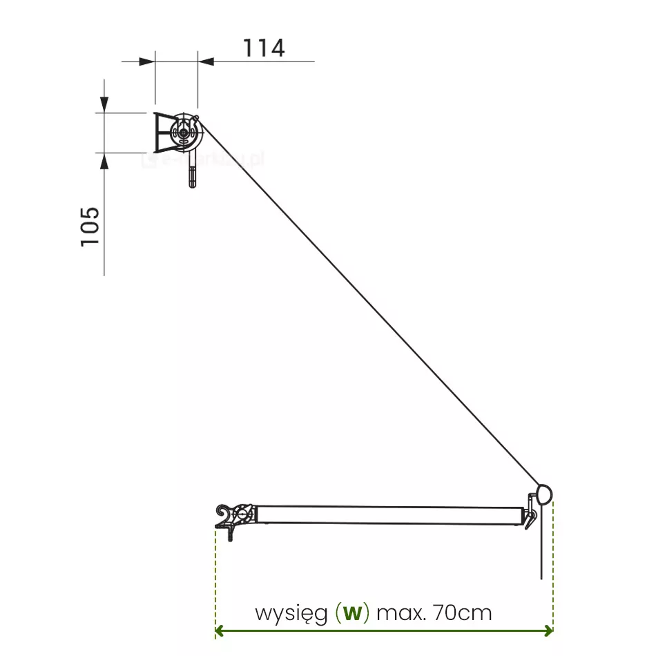 Messung der Markise mit Armen bis zum Handlauf. Bei der Bestellung geben wir immer das Außenmaß der Markise (S) zusammen mit den Griffen an. Wir geben auch das Maß (W) an, also die Länge der Arme, die konstant ist und 70 cm beträgt. Die Länge der Arme entspricht in diesem Fall der Ausladung der Markise.