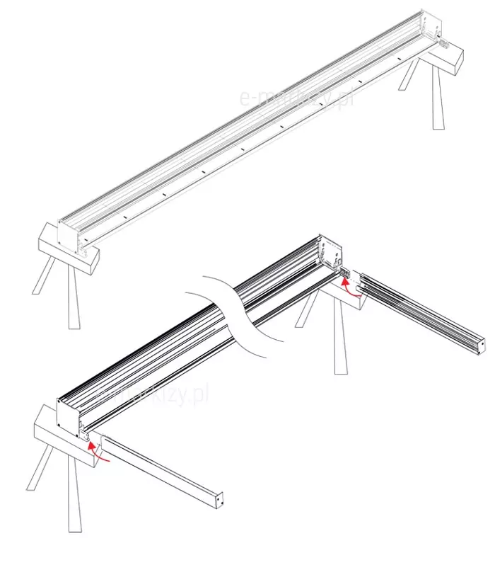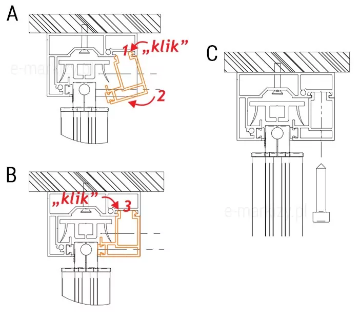 2. Das Basisprofil der Kassette sollte mit den Führungen verbunden werden, indem die Profile auf die Whiskers der Seitenabdeckungen geschoben werden