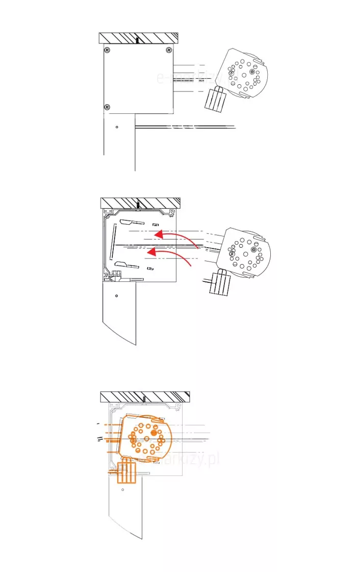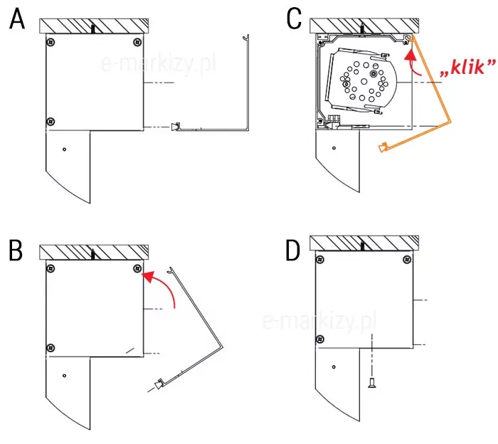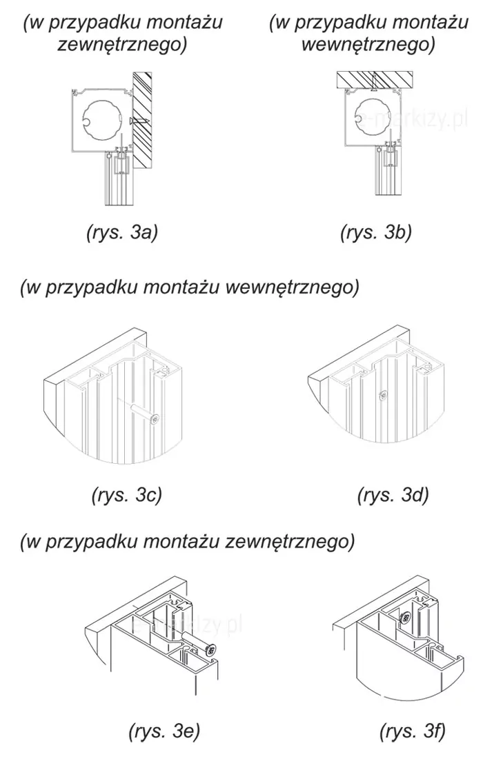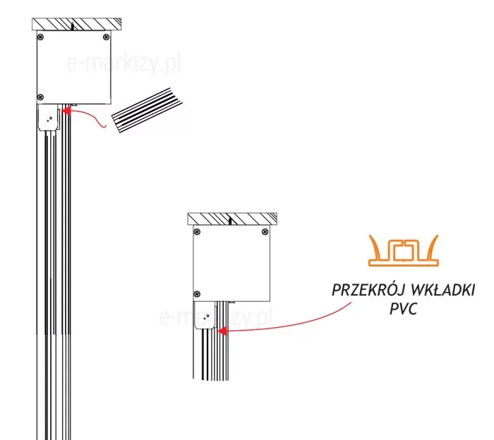 1. Prüfen Sie vor der Montage des Reflexes, ob die Fassade/Nische/Pergola-Struktur für Rollos geeignet ist. Bringen Sie zuerst den Reflex mit den Führungen an (nivellieren Sie sie), markieren und bohren Sie ein Loch im Profil für das Kabel, das den Antrieb antreibt