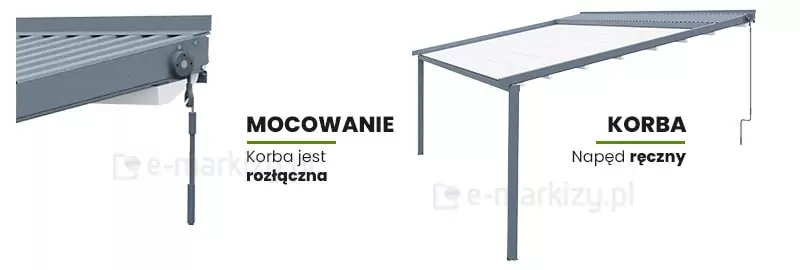Das Rollo kann mit einem Kurbelantrieb ausgestattet werden, der von außen oder innerhalb des Raumes gesteuert wird. Eine weitere Option sind Elektroantriebe in mehreren Varianten. Die Motoren sind in einer Version ohne Bedienfeld (die Möglichkeit der Steuerung mit einem kabelgebundenen Schlüssel oder einer beliebigen Automatisierung – Option 2 unten) und mit einem eingebauten Bedienfeld (Steuerung nur mit einer Fernbedienung – Option 3,4 unten) erhältlich. .