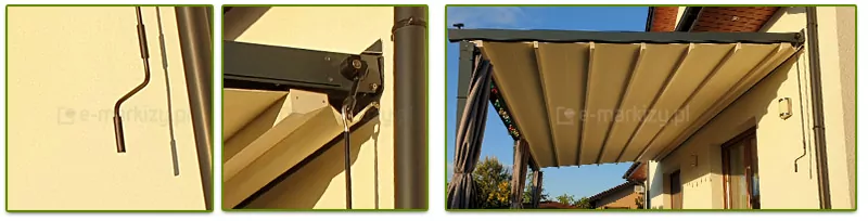 Gegen Aufpreis kann die Pergola mit einem Elektroantrieb ausgestattet werden. Es wird am Hauptwickelrohr montiert. Für den elektrischen Antrieb können wir einen herkömmlichen Schlüsselschalter oder eine Funkfernbedienung verwenden. Bei Bedarf können Wettersensoren installiert werden.