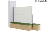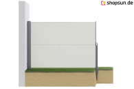 Die Seitenmarkise kann standardmäßig auf drei Arten befestigt werden. Variante 1: Frontpfosten – Montage auf hartem Untergrund. Variante 2: Frontpfosten – Montage auf weichem Untergrund. Variante 3: Wandhalterung.