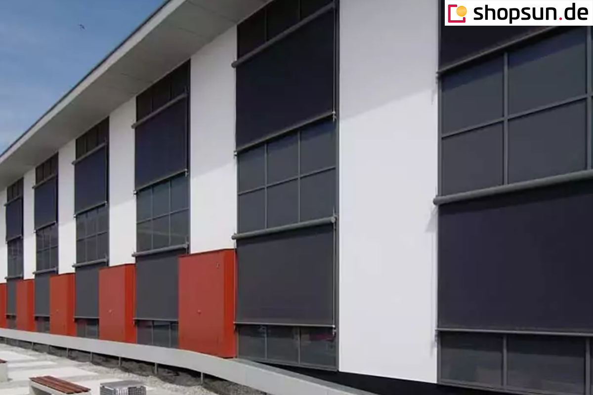Senkrechtmarkise 125 ist für die Fassadenmontage vorgesehen. Die maximale Breite der Abdeckung beträgt 3,5 m und die Höhe 4,25 m.