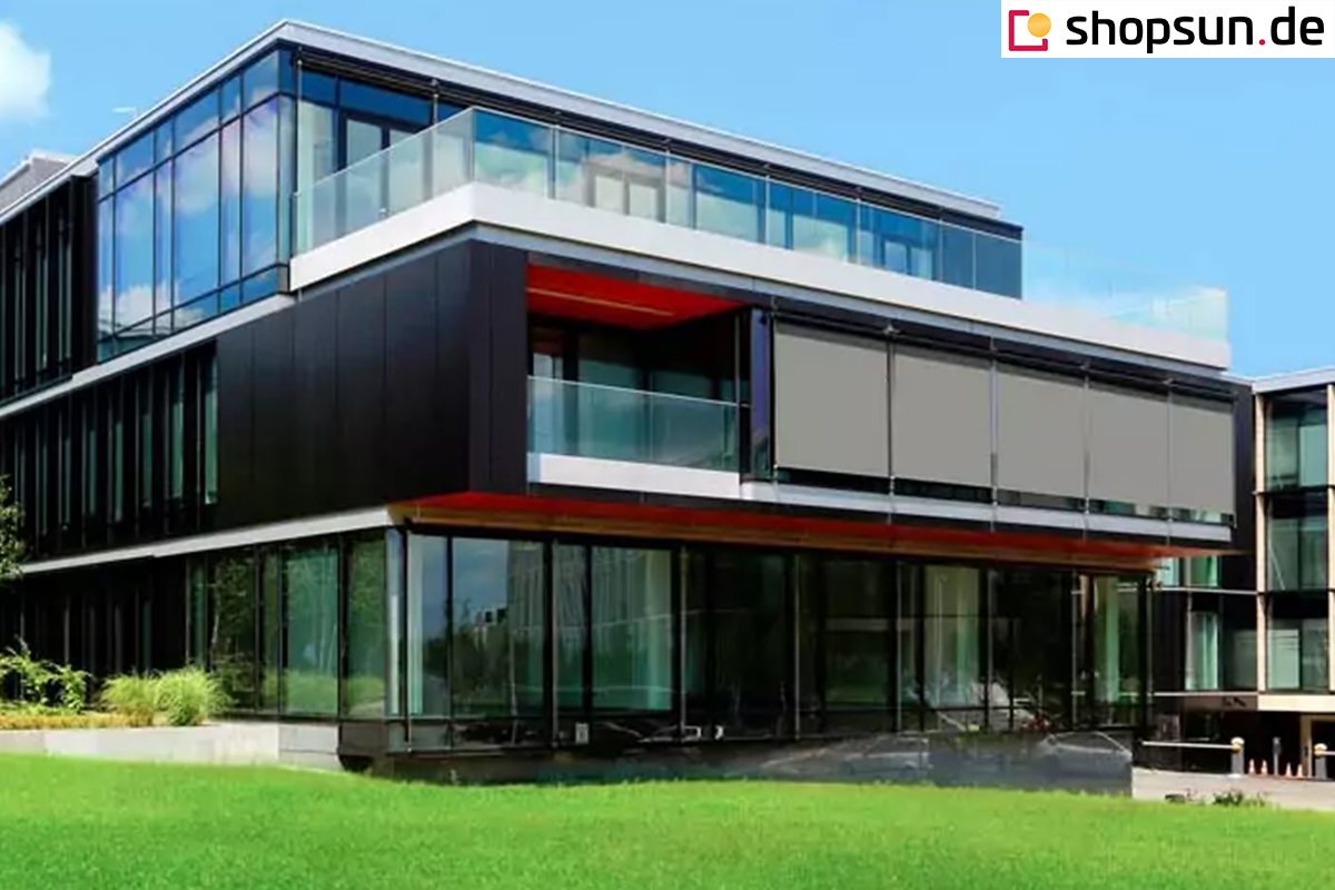 Senkrechtmarkise 125 Selt ist ein modernes Fassadensystem zur Beschattung von Räumen, das an der Gebäudefassade montiert wird. Es zeichnet sich durch eine einfache Montage aus. Die runde Kassette ist an Seilen montiert, die zusammen mit den Griffen das tragende Element des Systems sind.