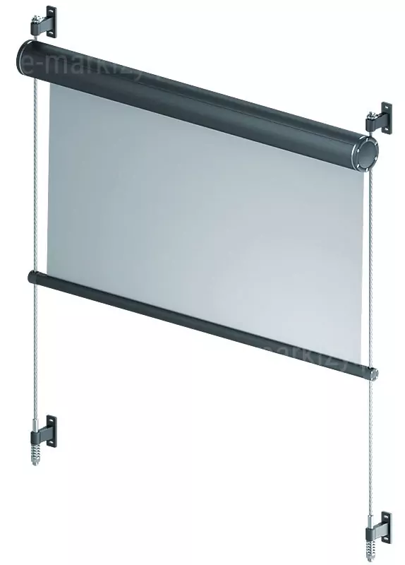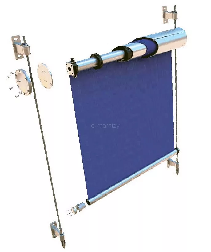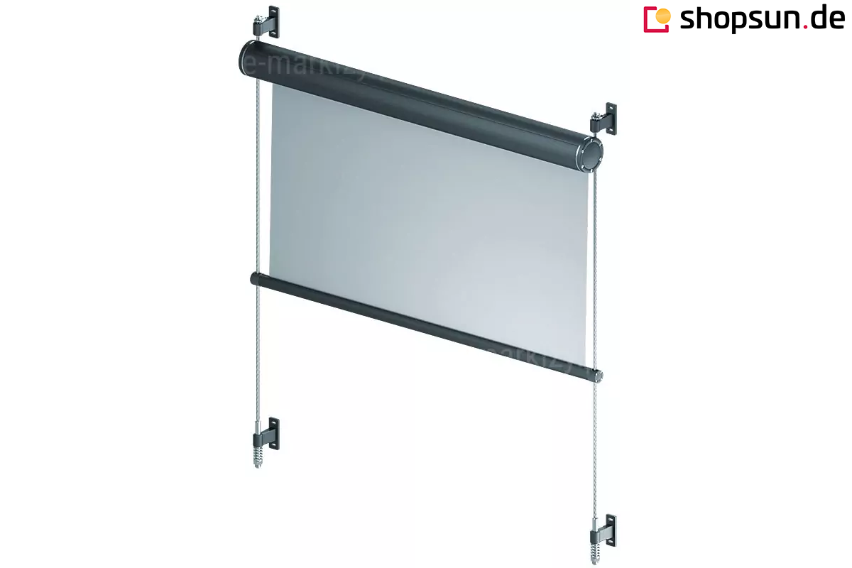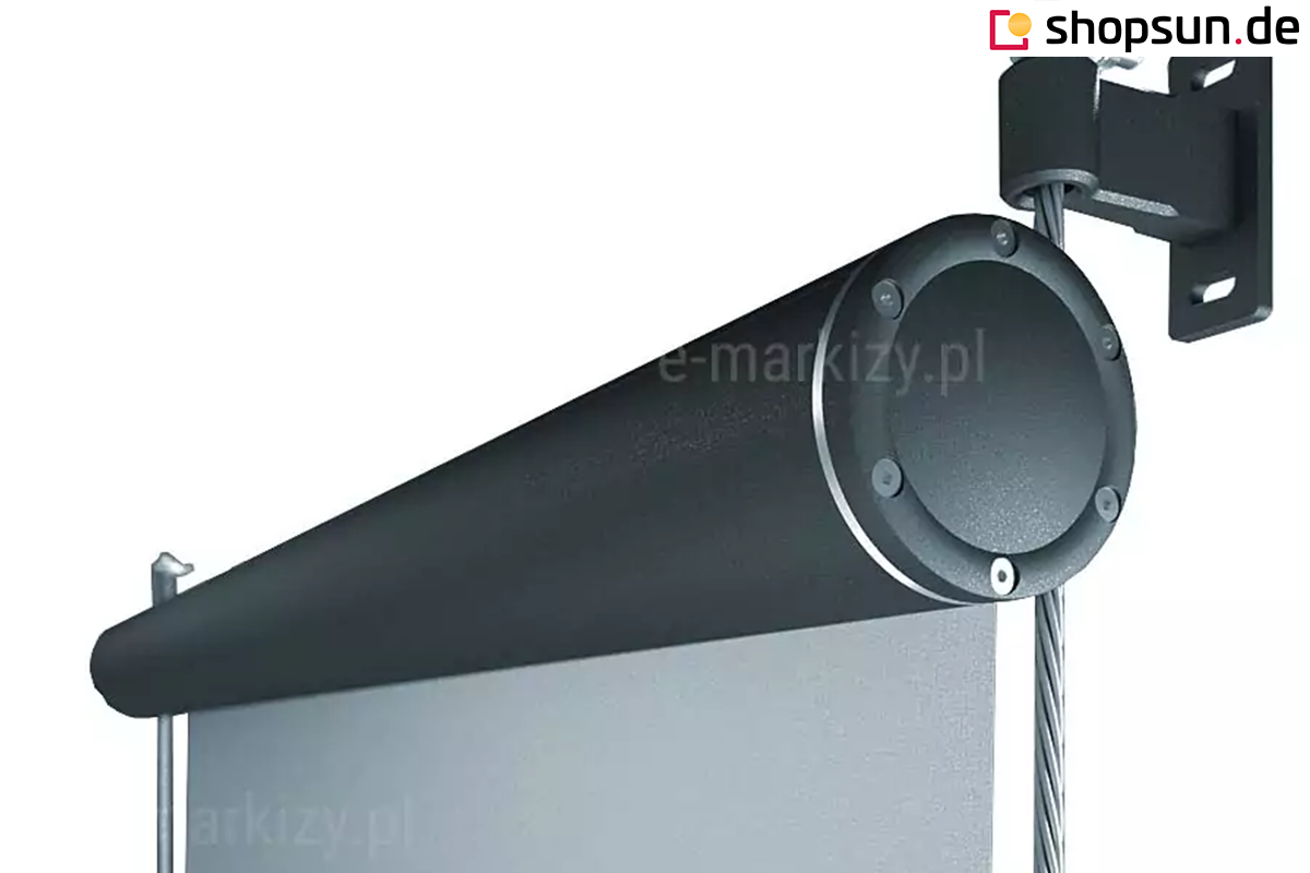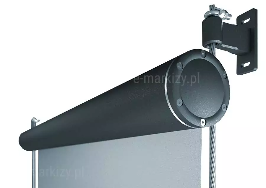 Senkrechtmarkise 125 ist ein modernes Fassadensystem zur Beschattung von Räumen, das an der Gebäudefassade montiert wird. Es zeichnet sich durch eine einfache Montage aus. Die runde Kassette ist an Seilen montiert, die zusammen mit den Griffen das tragende Element des Systems sind.