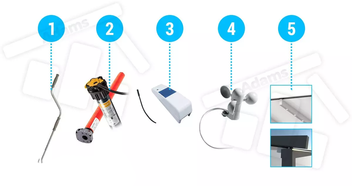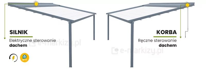 Standardowo pergola wyposażona jest w napęd ręczny, czyli sterowana jest korbą. Pergolę można wyposażyć w napęd elektryczny bez wbudowanej centrali radiowej (opcja 2), który sterowany jest za pomocą przełącznika ściennego. Za dopłatą pergolę możemy doposażyć w silnik elektryczny z wbudowaną centralką bezprzewodową, która umożliwia sterowanie zadaszeniem za pomocą pilota bezprzewodowego oraz czujników atmosferycznych, a także korzystanie z opcjonalnego oświetlenia LED. Dostępne są 2 napędy z wbudowaną centralą (opcja 3 i 4).
