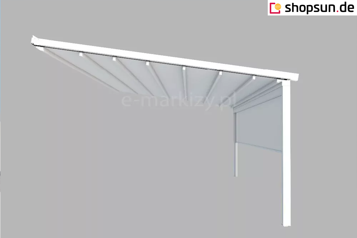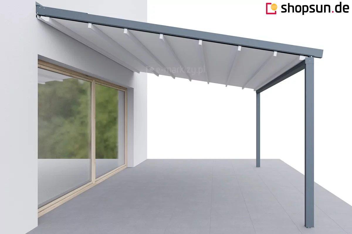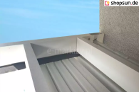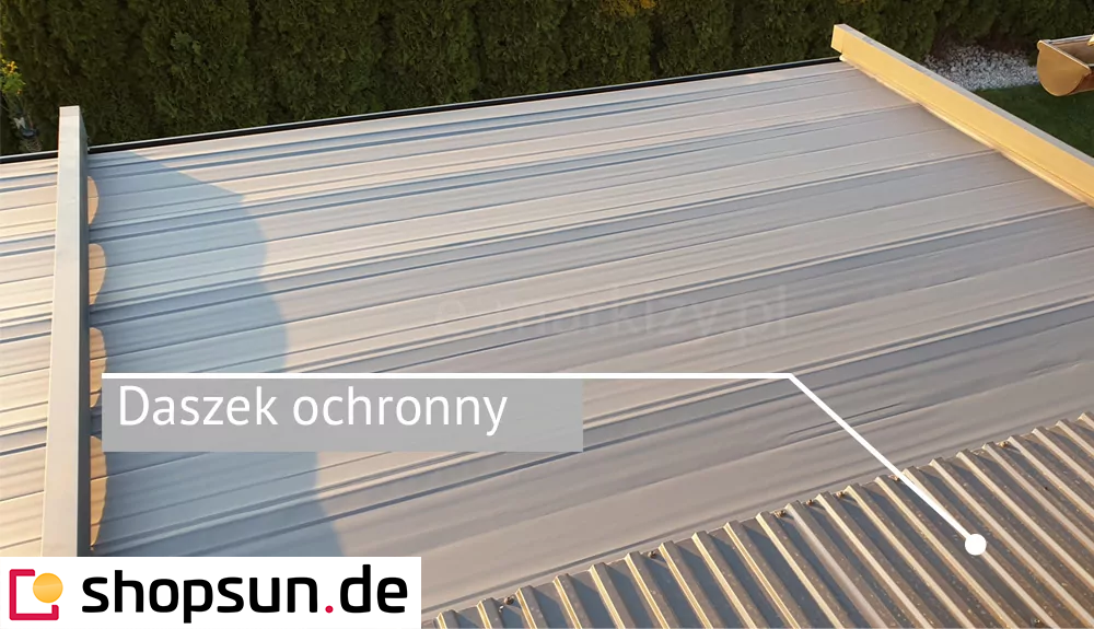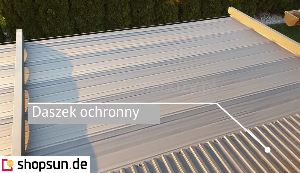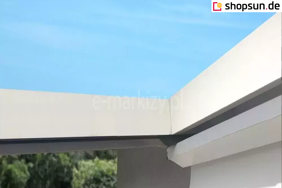 Do pergoli można domontować opcjonalnie daszek systemowy chroniący zwiniętą tkaninę od góry. Szczególnie przydatny w okresie, gdy pergola nie jest użytkowana przez dłuższy czas, a tkanina jest zwinięta.