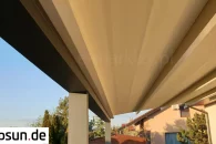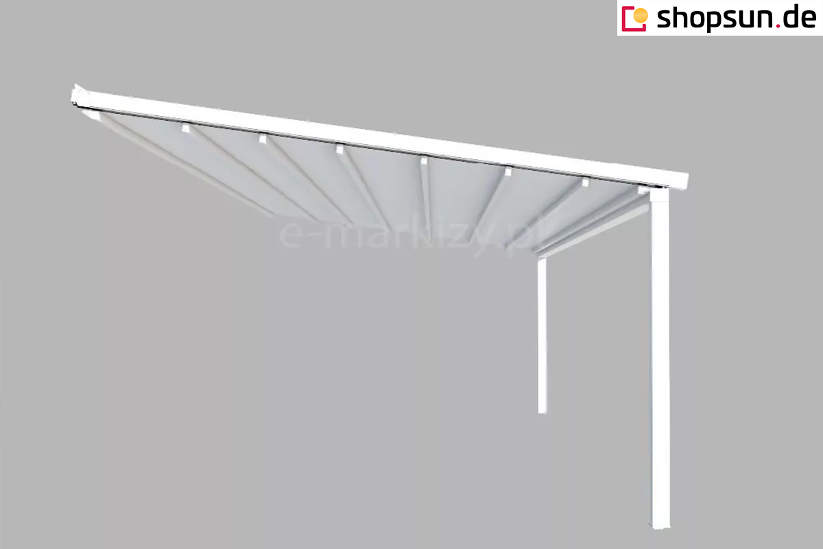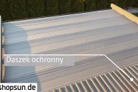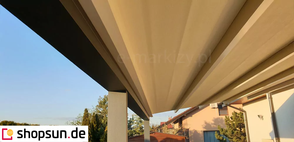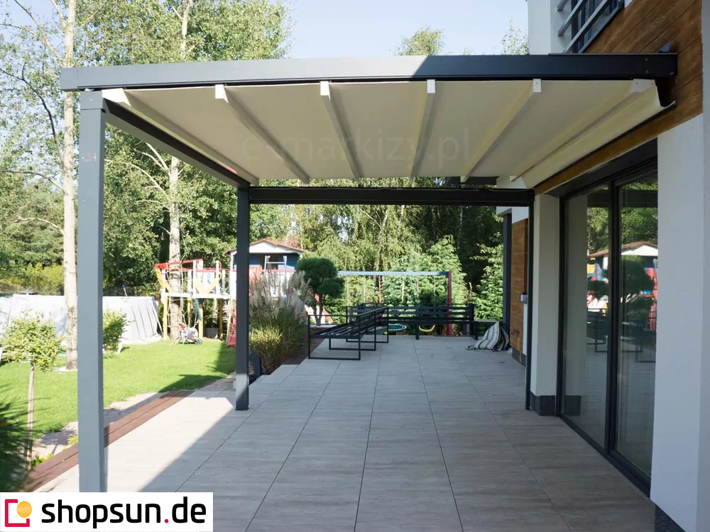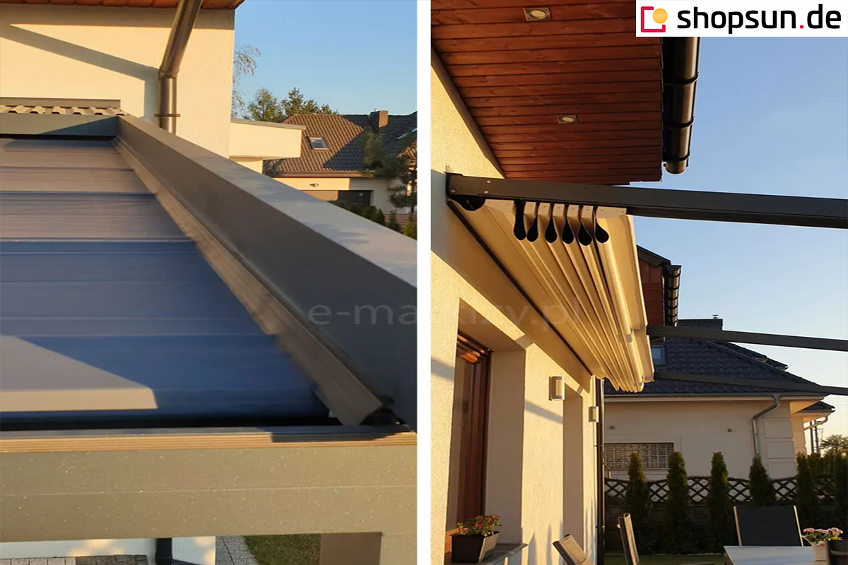 Do pergoli można domontować opcjonalnie daszek systemowy chroniący zwiniętą tkaninę od góry. Szczególnie przydatny w okresie, gdy pergola nie jest użytkowana przez dłuższy czas, a tkanina jest zwinięta.