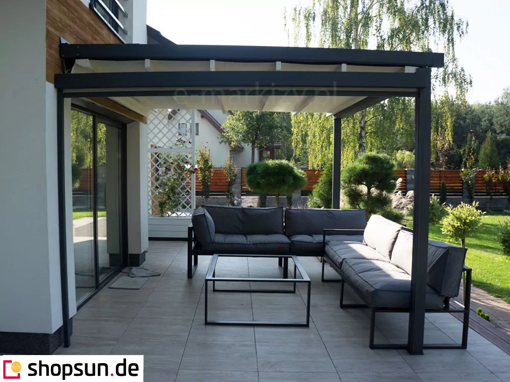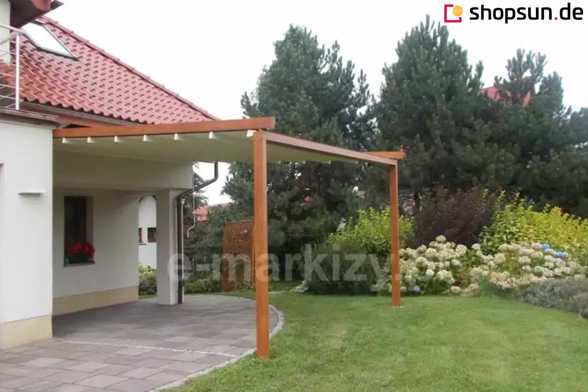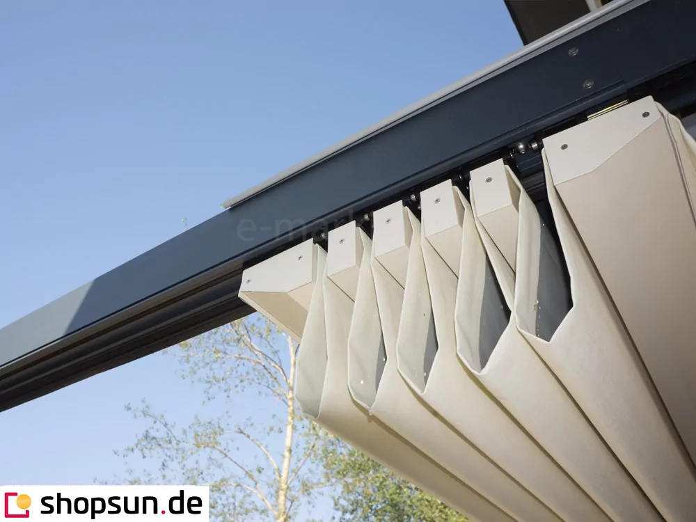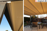 - Gegen Aufpreis kann die Pergola mit einem Elektromotor ausgestattet werden, der das Tuch automatisch aufrollt.