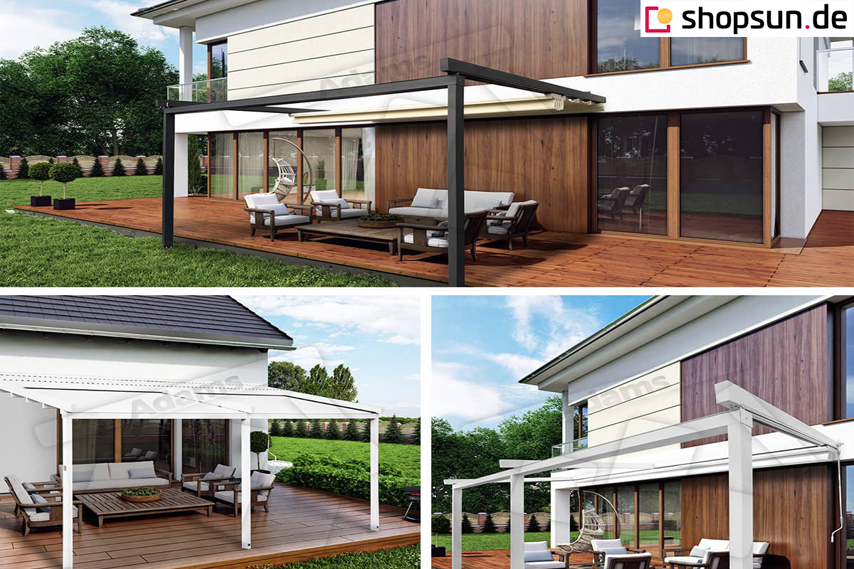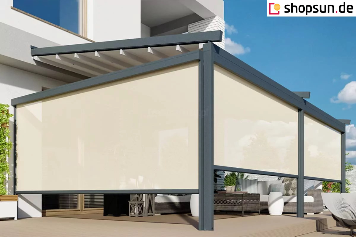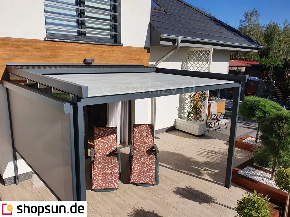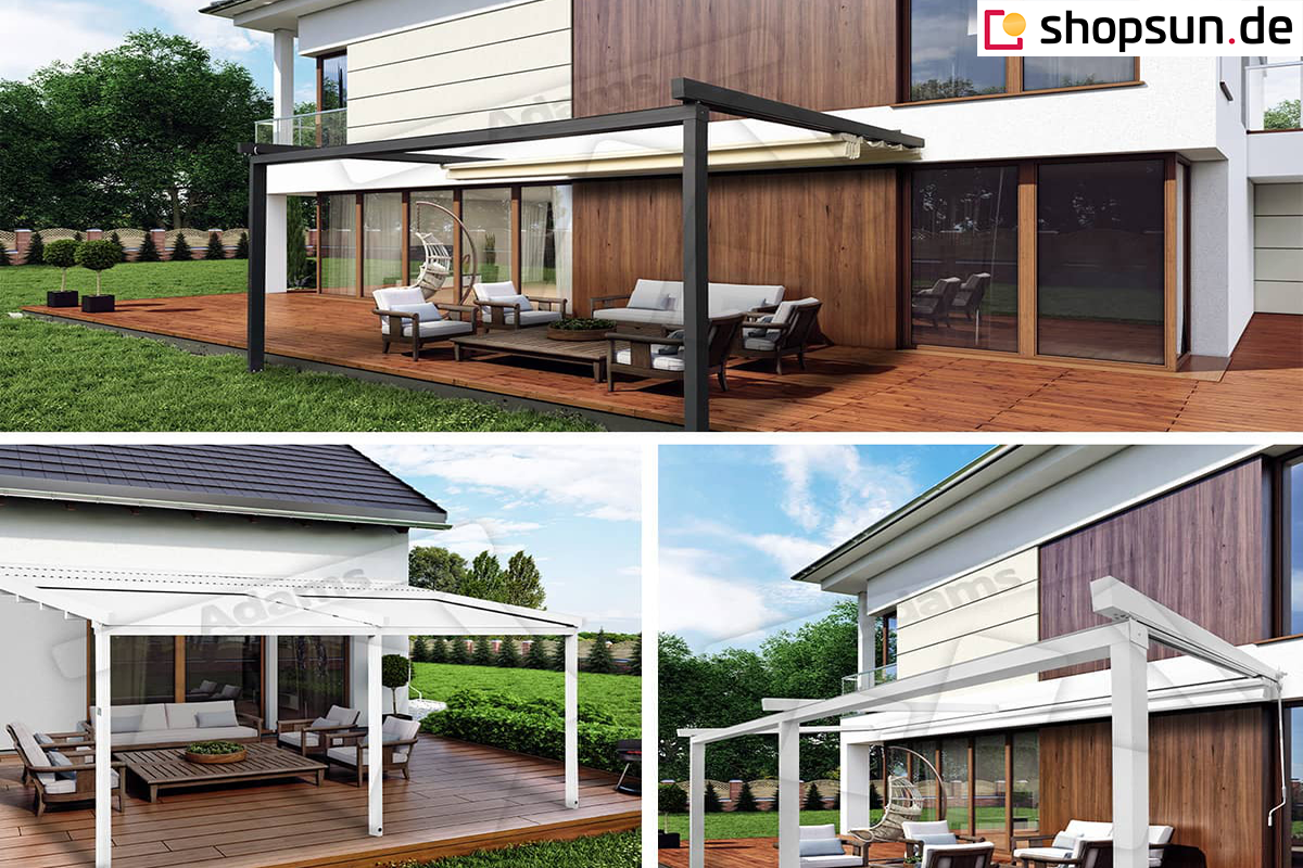 Die Luxo Wand-Terrassenpergola kann neben der Terrassenüberdachung auch Schutz vor Wind und auf- oder untergehender Sonne bieten. Durch die Überdachung der Pergola mit Reißverschlussabdeckungen können Sie den Wintergarten auch bei ungünstigem Wetter nutzen. Seitenreflektoren an der Pergola werden an allen Seiten des Bauwerks oder nur an einer bestimmten Seite angebracht, z.B. zum Schutz vor unerwünschten Blicken oder den Strahlen der aufgehenden Sonne. Die Reflexe werden per Handkurbel oder Automatik gesteuert.
