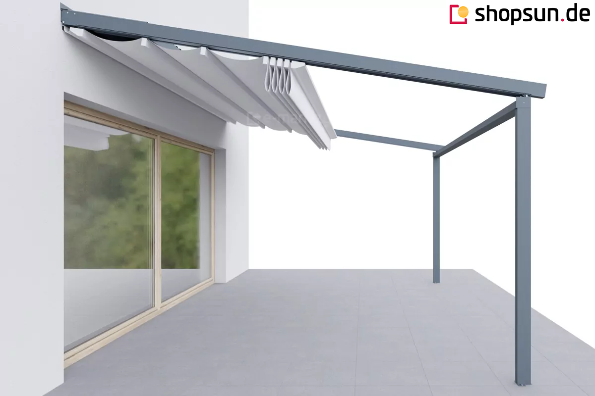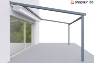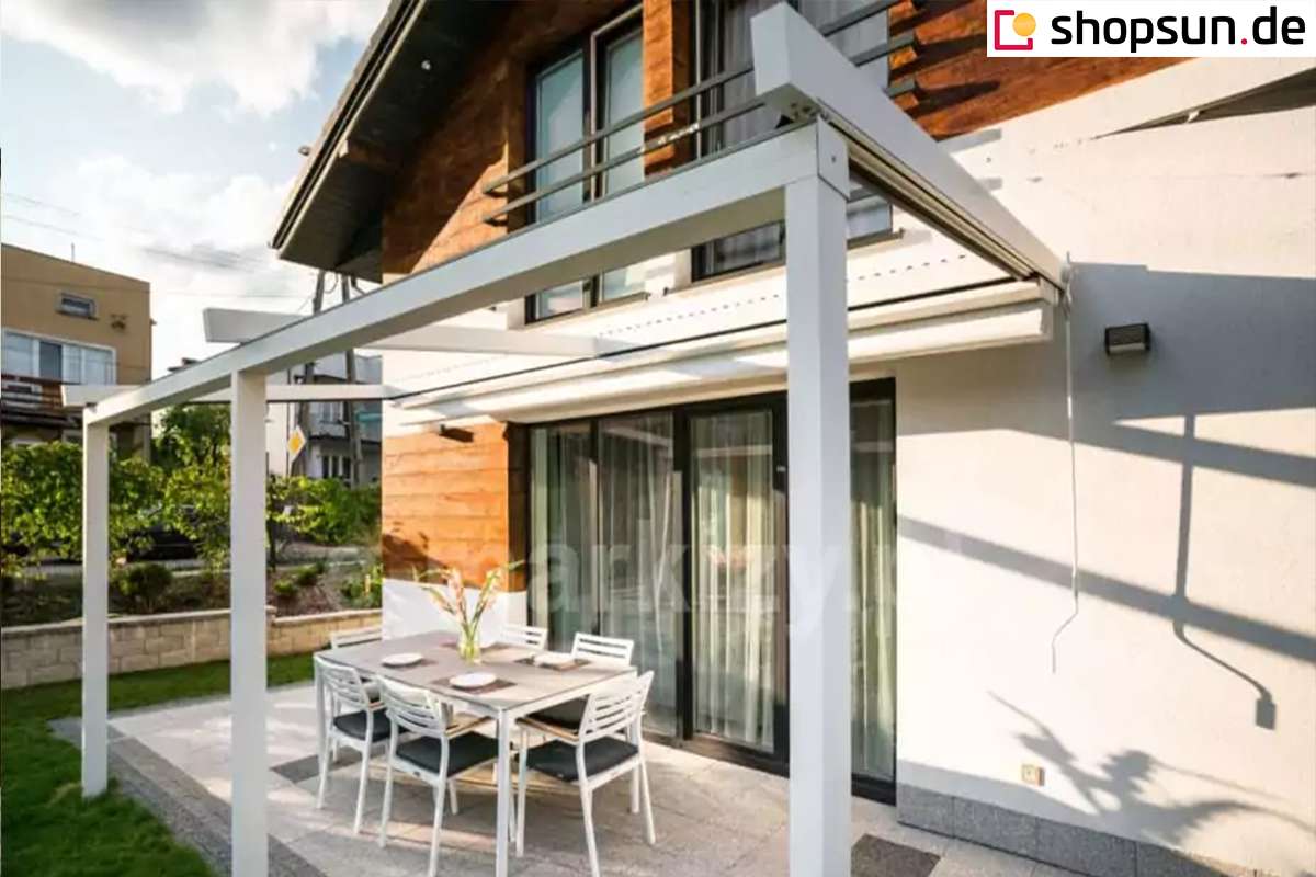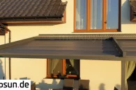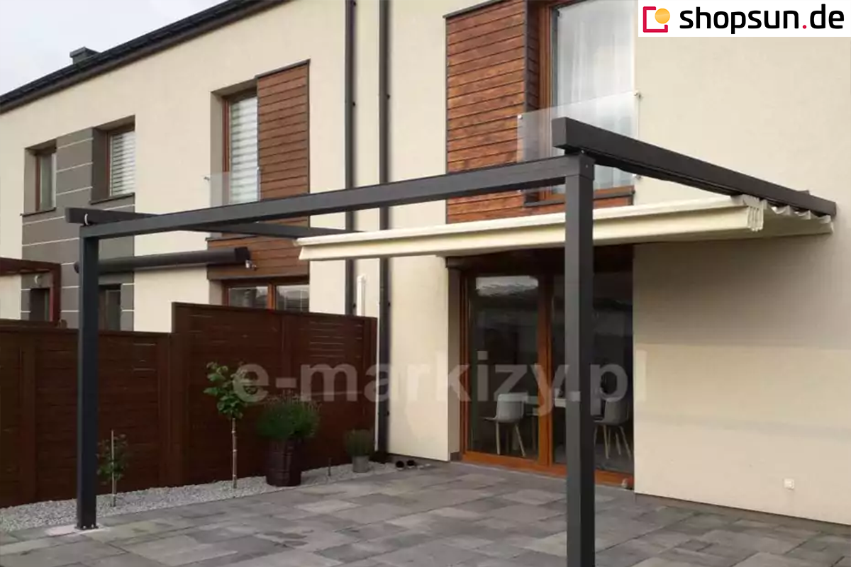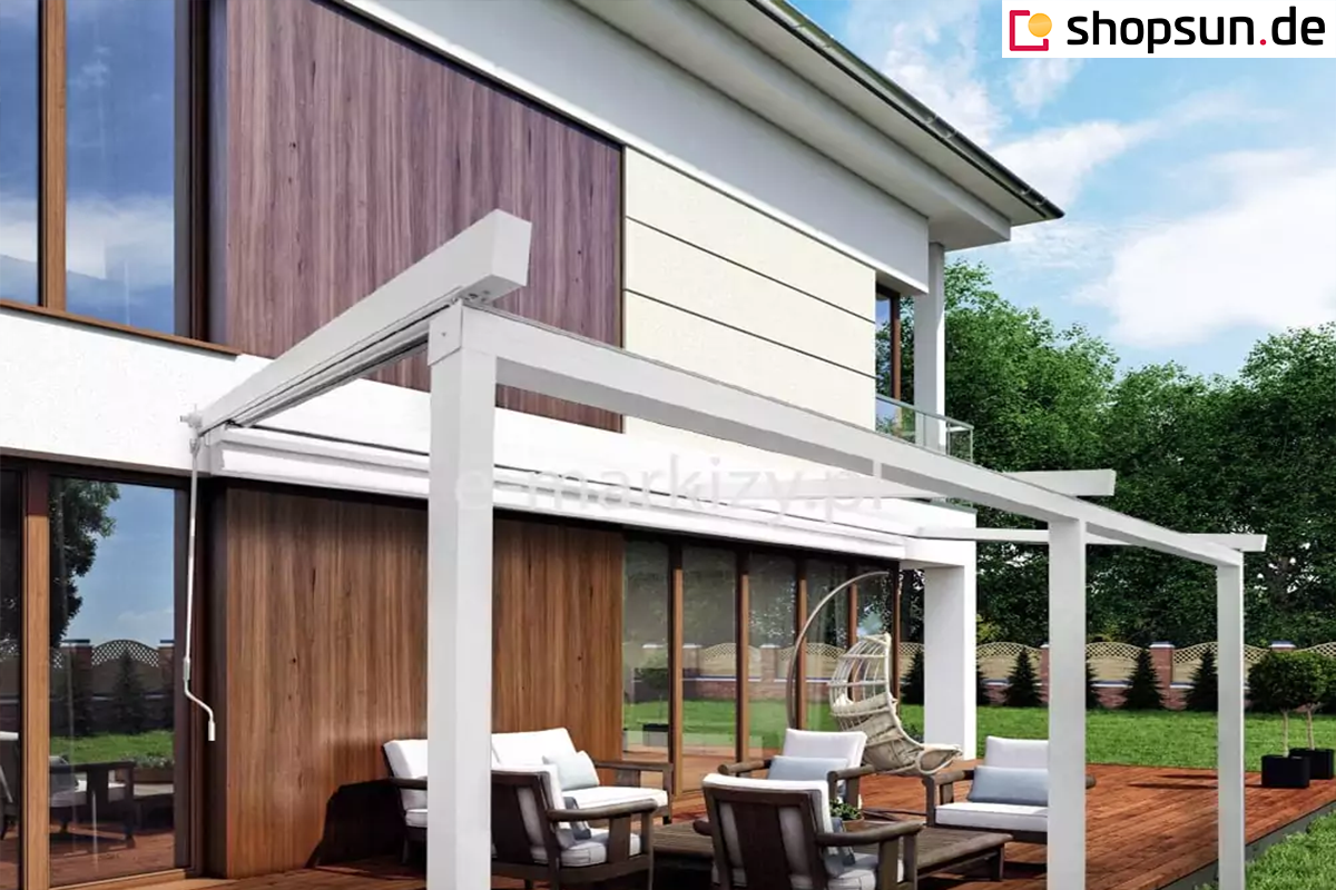 Die Luxo Wand-Terrassenpergola kann neben der Terrassenüberdachung auch Schutz vor Wind und auf- oder untergehender Sonne bieten. Durch die Überdachung der Pergola mit Reißverschlussabdeckungen können Sie den Wintergarten auch bei ungünstigem Wetter nutzen. Seitenreflektoren an der Pergola werden an allen Seiten des Bauwerks oder nur an einer bestimmten Seite angebracht, z.B. zum Schutz vor unerwünschten Blicken oder den Strahlen der aufgehenden Sonne. Die Reflexe werden per Handkurbel oder Automatik gesteuert.