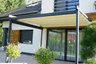 Do pergoli można domontować opcjonalnie daszek systemowy chroniący zwiniętą tkaninę od góry.
