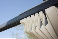 Die Luxo Wall Terrace Pergola ist eine Version der Pergola, die sowohl für die elektrische als auch für die manuelle Steuerung geeignet ist. Das Pergola-Modell zeichnet sich durch einen kleineren Querschnitt an Tragprofilen und Führungen aus und ist nur in der Wandversion erhältlich.