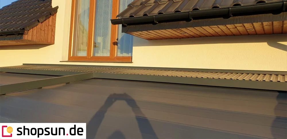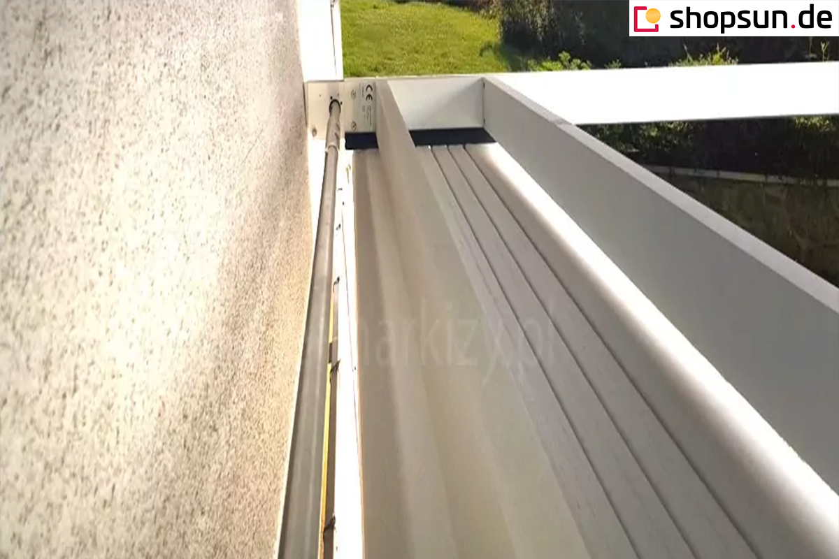 Systemüberdachung, also ein Schutzdach, das den aufgerollten Stoff vor Verschmutzung schützt. Die Kassette ist komplett aus Aluminium gefertigt und in der Farbe der Struktur lackiert.